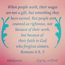 ‘Iemand die zijn loon verdient, krijgt het niet als gunst maar als een recht. Maar iemand zonder verdienste, die echter vertrouwt op Hem Die de schuldige vrijspreekt, wordt vanwege zijn vertrouwen rechtvaardig verklaard.‘ (Uit Romeinen 4 de verzen 4-5)