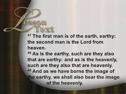 ‘Zo staat er ook geschreven: “De eerste mens, Adam, werd een levend aards wezen.” Maar de laatste Adam werd een levendmakende Geest. Niet het Geestelijke is er als eerste, maar het aardse; pas daarna komt het Geestelijke. De eerste mens kwam uit de aarde voort en was stoffelijk, de tweede Mens is hemels. Ieder stoffelijk mens is als de eerste mens, ieder hemels mens is als de Tweede. Zoals we nu de gestalte van de stoffelijke mens hebben, zo zullen we straks de gestalte van de hemelse Mens hebben.‘ (Uit 1 Korintiërs 15 de verzen 45-49)