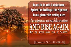 ‘Jullie goddelozen, belaag niet het huis van een rechtvaardige, verwoest zijn woning niet. Een rechtvaardige komt zevenmaal ten val, maar telkens staat hij op. Een goddeloze struikelt door zijn slechte daden, en komt voorgoed ten val.‘ (uit Spreuken 24 vers 16)