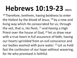 ‘Broeders en zusters, dankzij het bloed van Jezus kunnen we zonder schroom binnengaan in het heiligdom, omdat Hij voor ons met Zijn lichaam een weg naar een nieuw leven gebaand heeft, door het voorhangsel heen. We hebben nu een Hogepriester die dienstdoet in het huis van God; laten we God dan naderen met een oprecht hart en een vast geloof, nu ons hart gereinigd is, wij van een slecht geweten bevrijd zijn en ons lichaam met zuiver water is gewassen. Laten we zonder te wankelen datgene blijven belijden waarop we hopen, want Hij die de belofte heeft gedaan is trouw.‘ (Uit Hebreeën 10 de verzen 19-23)