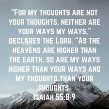 ‘Want mijn gedachten zijn niet uw gedachten en uw wegen zijn niet mijn wegen, luidt het woord des HEREN. Want zoals de hemelen hoger zijn dan de aarde, zo zijn mijn wegen hoger dan uw wegen en mijn gedachten dan uw gedachten.’ (Uit Jesaja 55 de verzen 8-9)