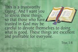 ‘Deze Boodschap is betrouwbaar (zie Titus 3 : 1-7). Ik wil dat je hierover met overtuiging spreekt, opdat zij die op God vertrouwen zich erop toeleggen om het goede* te doen. Daar heeft iedereen (in gemeente en wereld) baat bij.’ ( Uit Titus 3 vers 8 )