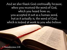 ‘Wij danken God onophoudelijk dat jullie Zijn Woord, dat jullie van ons ontvangen hebben, niet hebt aangenomen als een boodschap van mensen, maar als wat het werkeljk is: als het Woord van God dat ook werkzaam is in jullie die geloven.‘ (Uit 1 Tessalonicensen vers 13)