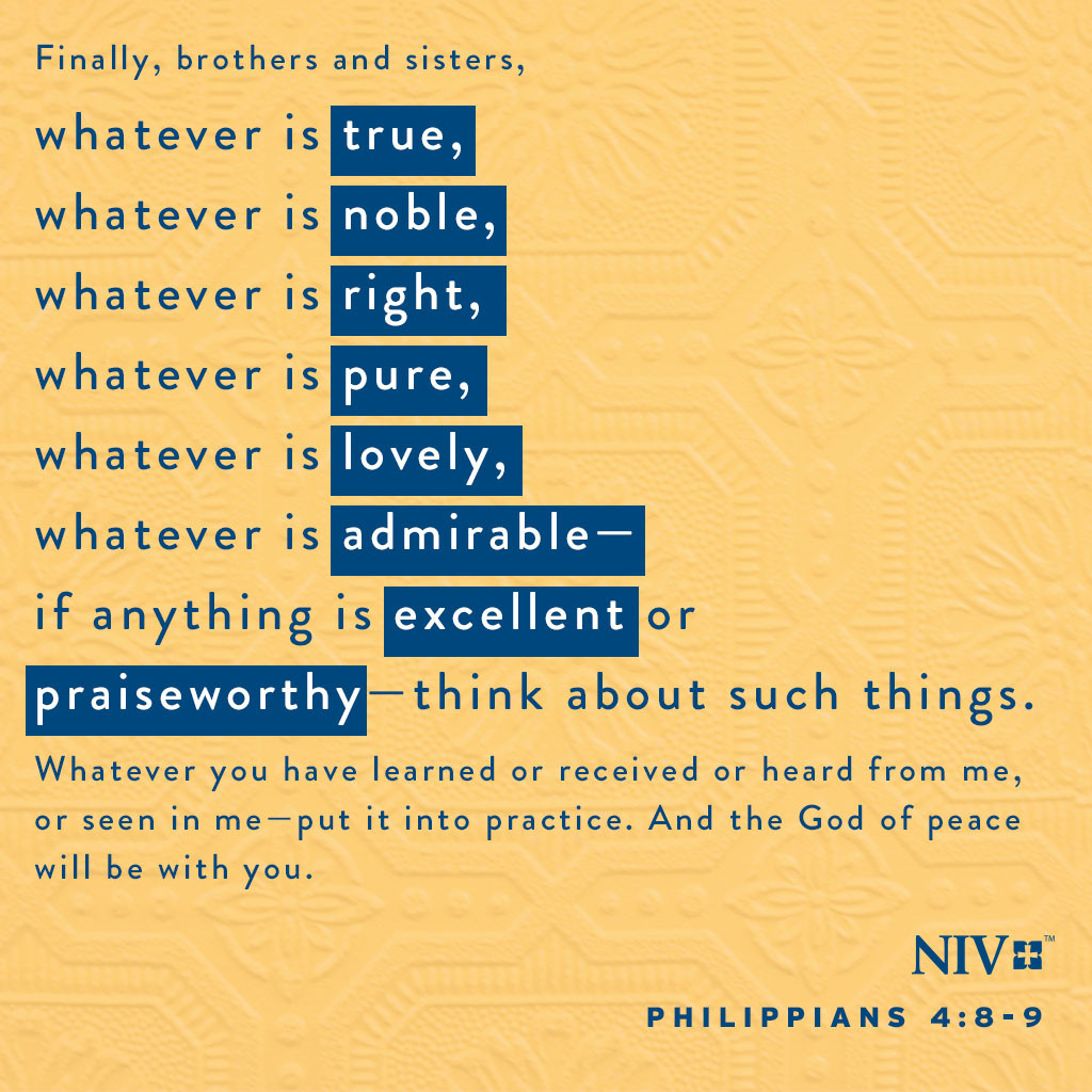 ‘Tenslotte broeders en zusters, schenk aandacht aan alles wat waar is, alles wat edel is, alles wat rechtvaardig is, alles wat zuiver is, alles wat lieflijk is, alles wat eervol is, kortom aan alles wat deugdzaam is en lof verdient. Doe alles wat ik jullie heb geleerd en overgedragen, wat ik jullie heb verteld en laten zien. Doe het, en de God van de vrede zal met jullie zijn.‘ (Uit Filippenzen 4 de verzen 8-9)