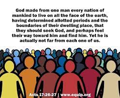 ‘De God Die de wereld heeft gemaakt en alles wat er leeft , Hij Die hemel en aarde bestuurt, woont niet in door mensenhanden vervaardigde tempels (Godshuizen). Hij laat Zich ook niet bedienen door mensenhanden alsof er nog iets is dat Hij nodig heeft, Hij Die Zelf aan iedereen (en alle schepselen) het leven en adem en al het andere schenkt. Uit één mens heeft Hij de hele mensheid gemaakt, die Hij over de hele aarde heeft verspreid…’ (…) ‘God slaat geen acht op de tijden dat men Hem niet (meer!) kende, maar roept nu overal de mensen op een nieuw leven te beginnen (zich te bekeren)…‘ (Uit Handelingen 17 vers 30).