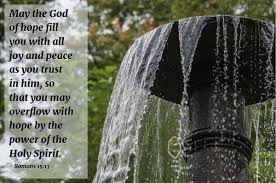 ‘Moge God, Die ons hoop geeft, u in het geloof geheel en al vervullen met vreugde en vrede, zodat uw hoop overvloedig zal zijn door de kracht van de heilige Geest.’ (Uit Romeinen 15 vers 13)