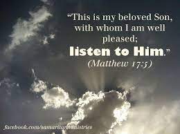 ‘Terwijl hij (Petrus) nog sprak, zie, daar overschaduwde hen een lichtende wolk, en zie, een stem uit de wolk zei: Deze is mijn Zoon, de geliefde, in wie Ik mijn welbehagen heb; hoort naar Hem!‘ (Uit Matteüs 17 Vers 5)