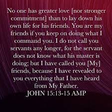 ‘Niemand heeft grotere liefde, dan dat hij zijn leven inzet voor zijn vrienden. Jullie zijn Mijn vrienden, indien jullie doen, wat Ik jullie gebied. Ik noem jullie niet meer slaven, want de slaaf weet niet, wat zijn heer doet; maar jullie heb Ik vrienden genoemd, omdat Ik alles, wat Ik van mijn Vader gehoord heb, jullie heb bekend gemaakt.‘ (uit Johannes 13 de verzen 13-15)