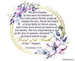 ‘In al onze gebeden danken wij God, de Vader van onze Heer Jezus Christus, voor jullie, want wij hebben gehoord dat jullie in Christus Jezus gelooft en alle heiligen liefhebt, omdat jullie hopen op wat in de hemel voor jullie gereed ligt. Daarover hebben jullie gehoord toen aan jullie de waarheid verkondigd werd en het Evangelie jullie bereikte. Overal in de wereld draagt het (nu) vrucht en groeit het, ook bij jullie, (en dat) vanaf de dag dat jullie over Gods genade hoorden en de ware betekenis ervan begreep. Onze geliefde medewerker Epafras, die zich als getrouw dienaar van Christus voor jullie inzet, heeft jullie daarin (verder) onderwezen. En hij heeft ons verteld over de liefde die de Geest (!) in jullie opwekt.’ (Uit Kolossenzen 1 : 1-11 de verzen 3-8)