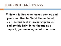 ‘Het is God Die jullie en ons Christus als fundament geeft, Die ons allen heeft gezalfd, heeft gewaarmerkt als Zijn eigendom (met en door onze Doop) en ons als voorschot de Geest gegeven heeft.’ (Uit 2 Korintiërs 1 de verzen 21-22)