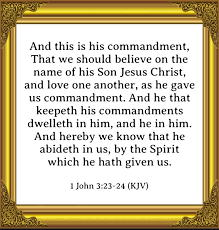 ‘Dit is Zijn gebod: dat we geloven in de Naam van Zijn Zoon Jezus Christus en elkaar liefhebben, zoals Hij ons heeft opgedragen. Wie zich aan Zijn geboden houdt blijft in God, en God blijft in hem/haar. Dat Hij in ons blijft, weten we door de Geest Die Hij ons gegeven heeft.’ (Uit 1 Johannes 3 de verzen 23-24)