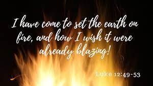 ‘Ik ben gekomen om op aarde een vuur (!) te ontsteken, en wat zou ik graag willen dat het al brandde! Ik moet een doop ondergaan, en ik wordt hevig gekweld zolang die niet volbracht is. Denken jullie dat ik gekomen ben om vrede te brengen op aarde? Geenszins, zeg Ik jullie, Ik kom verdeeldheid brengen…’ (Uit Lukas 13 de verzen 49-51)