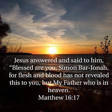 ‘En Jezus antwoordde en zei: Zalig ben je, Simon Bar-Jona; want vlees en bloed hebben je dat niet geopenbaard, maar Mijn Vader Die in de hemel is.‘ (Uit Matteüs 16 vers 17)