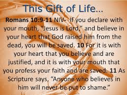 ‘Als je mond belijdt dat Jezus Heer is en je hart gelooft dat God Hem uit de doden heeft opgewekt, zal je worden gered. Want de Schrift zegt: “Wie in Hem gelooft, komt niet bedrogen uit.”‘ (Uit Romeinen 10 de verzen 9-11)
