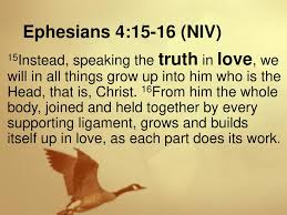 ‘Dan zullen we, door ons aan de waarheid te houden – de waarheid van het Evangelie! – en elkaar lief te hebben – dat hoort er onlosmakelijk bij! -, samen (!) volledig toegroeien naar Hem die het hoofd is: Christus. Vanuit dat Hoofd krijgt het Lichaam samenhang, en wordt het ondersteund en bijeengehouden door alle gewrichtsbanden. Ieder deel draagt bij tot de groei van dat Lichaam, dat zo Zichzelf opbouwt door de Liefde.’ (Uit Efeziërs 4 de verzen 15-16)