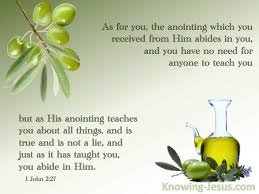 ‘Wat jullie zelf betreft (ouderen en jongeren/kinderen – zie 1 Johannes 2 : 12-14): de zalving die jullie van Hem ontvangen hebben – bij jullie Doop! – is blijvend, jullie hebben geen leraar nodig (om daarvan verzekerd te kunnen zijn!). Zijn zalving leert jullie alles naar waarheid zonder bedrog (De Heilige Geest is het die jullie helpt bij het verdere onderwijs in Gods Woord, zoals Hij daartoe ook herders en leraars en ouders gebruikt). Blijf daarom in Hem zoals Zijn zalving jullie geleerd heeft.‘ (Uit 1 Johannes 2 vers 27)