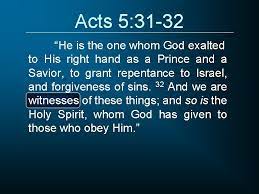 ‘De God van onze voorouders heeft Hem (Jezus) een plaats gegeven aan Zijn rechterhand en Hem tot Leidsman en Redder verheven om de Israëlieten tot inkeer te brengen en hun zonden te vergeven. Daarvan getuigen wij (als Gods gezanten), en daarvan getuigt ook de Heilige Geest (in de harten van de gelovigen), Die God geschonken heeft aan wie Hem gehoorzamen.‘ (Uit Handelingen 5 de verzen 31-32)