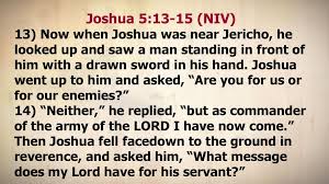 ‘Toen Jozua eens in de omgeving van Jericho liep, zag hij plotseling tegenover zich een man met een getrokken zwaard in de hand. Jozua ging op hem af en vroeg: “Hoor je bij ons of bij de vijand?” Bij geen van beide, Ik ben de aanvoerder van het leger van de HEER. Daarom ben Ik hier.”‘ (…) ‘De HEER zei: “Ik (!) lever Jericho met al zijn dappere helden aan je uit.“‘ (Uit Jozua 5 de verzen 13-14 en uit 6 vers 2)