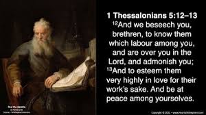 ‘Wij vragen jullie, broeders en zusters, diegenen onder jullie te erkennen die zich op gezag van de Heer ervoor inzetten jullie te leiden en terecht te wijzen. Jullie moeten hen om hun werk veel liefde en respect betonen. Leef in vrede met elkaar.’ (Uit 1 Tessalonicenzen 5 de verzen 12-13)