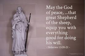 ‘De God nu van de vrede, Die de grote Herder van de schapen, onze Heere Jezus Christus, uit de doden heeft teruggebracht, op grond van het bloed van het eeuwige verbond, moge u toerusten tot elk goed werk om Zijn wil te doen, en in u werken wat in Zijn ogen welbehaaglijk is, door Jezus Christus. Hem zij de heerlijkheid in alle eeuwigheid. Amen.’ (Uit Hebreeën 13 de verzen 20-21)