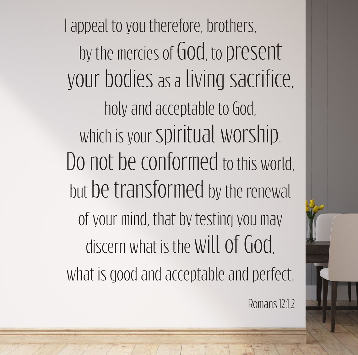 ‘Broeders en zusters, met een beroep op de barmhartigheid van onze God, vraag ik jullie om jezelf als een levend, heilig en God welgevallig offer in Zijn dienst te stellen, want dat is de ware eredienst (1a) voor jullie. Jullie zullen jezelf niet aanpassen aan deze wereld (en haar wijsheid), maar veranderen door jullie gezindheid te vernieuwen, om zo te ontdekken wat God van ons verlangt en wat goed, volmaakt (1b) en Hem welgevallig is.’ (Uit Romeinen 12 vers 1)