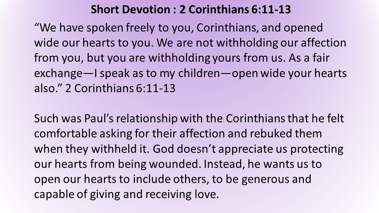 ‘Wij zeggen jullie dit alles ronduit, broeders en zusters in Korinthe, want wij hebben jullie in ons hart gesloten. Niet wij schieten in genegenheid voor jullie tekort, maar jullie in jullie genegenheid voor ons. Nu dan, ik vraag jullie alsof jullie mijn eigen kinderen zijn: sluit op jullie beurt ons in jullie hart.’ ((Uit 2 Korintiërs 6 uit de verzen 4-13 de verzen 11-13)