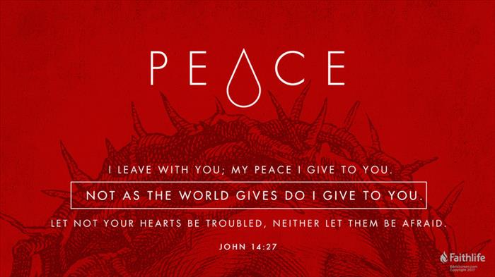 ‘Ik laat jullie Mijn vrede na; Mijn vrede geef ik jullie, zoals de wereld die niet geven kan. Maak je niet ongerust en verlies de moed niet. Jullie hebben toch gehoord dat Ik zei dat Ik wegga en bij jullie terug zal komen. Ik vertel jullie dit nu, zodat jullie het geloven wanneer het zover is.’ (Uit Johannes 14 uit de verzen 27-31 : 27-29)