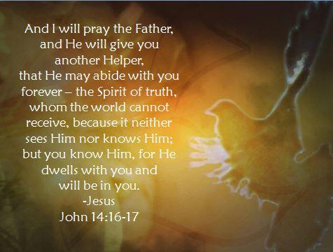 ‘En Ik zal de Vader bidden, en Hij zal jullie een andere Trooster* geven, opdat Hij bij jullie blijft tot in eeuwigheid, namelijk de Geest van de waarheid, Die de wereld niet kan ontvangen, want zij ziet Hem niet en kent Hem niet, maar jullie kennen Hem, want Hij blijft bij jullie en zal in jullie zijn.‘ (Uit Johannes 14 de verzen 16-17)