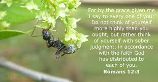 ‘Met een beroep op de genade die mij geschonken is, zeg ik jullie allen dat je jezelf niet hoger moet aanslaan dan je kunt verantwoorden, maar verstandig (en dus bescheiden) over jezelf moet denken. Denk overeenkomstig het geloof, dat is de maatstaf die God ons heeft gegeven…’ (Uit Romeinen 12 uit de verzen 1-3 : 3)