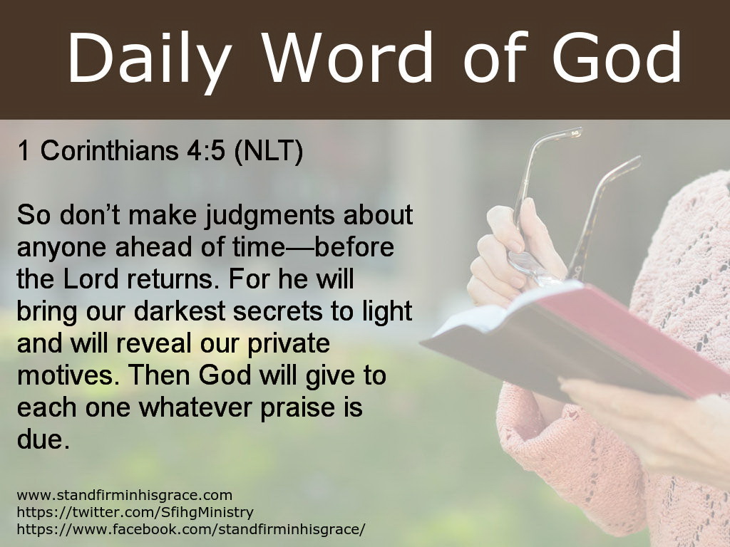 ‘Het is de Heer die over mij/ons oordeelt. Houd dus op met oordelen – en daarmee de één te verheffen boven de ander – en wacht de tijd af dat de Heer komt, omdat Hij het is die aan het licht zal brengen wat in het duister verborgen is en zal onthullen wat er in de harten van mensen omgaat. En dan zal God het zijn die ieder de lof geeft die hem of haar toekomt’ (1 Korintiërs 4 de verzen 4b-5).