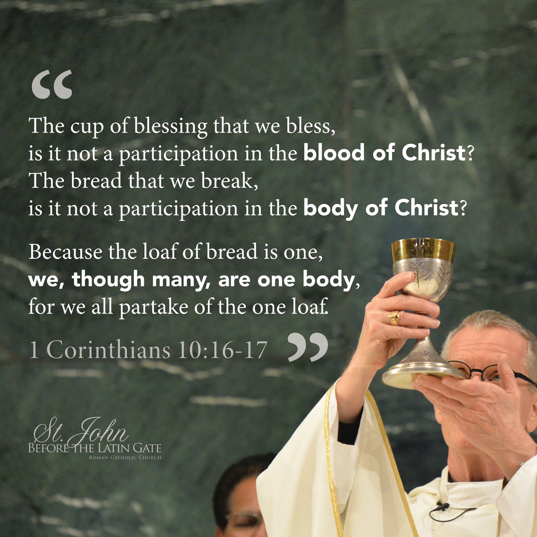 ‘Maakt de beker waarvoor wij God loven en danken ons niet één met het bloed van Christus? Maakt het brood dat wij eten ons niet één met het lichaam van Christus? Omdat het één brood is zijn wij, hoewel met velen, één lichaam, want wij hebben allen (!) deel aan dat ene Brood.’ (2) (Uit 1 Korintiërs 10 de verzen 16-17)