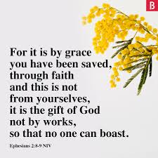 ‘Door Zijn genade zijn jullie immers gered, dankzij jullie geloof. Maar dat (geloof) danken jullie niet aan jezelf; het is een geschenk van God en geen gevolg van jullie daden, dus niemand kan er zich op laten voorstaan.’ (Uit Efeziërs 2 uit de verzen 4-10 : 8-9)