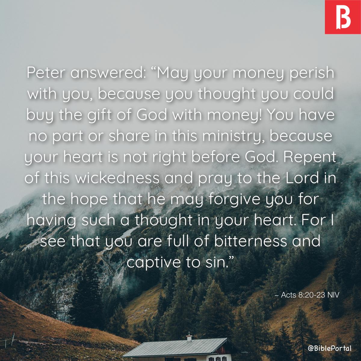(1a) Deze Simon (de ex-tovenaar) had wel vanwege het werk van de Heilige Geest zijn hart geopend voor het Evangelie en zich laten dopen, maar hij had als zuigeling in het geloof nog niet geestelijk leren denken (zie 1 Korintiërs 3!) en hij zag het Evangelie als handelswaar, net zoals hij z’n tovenaarspraktijken had gebruikt om zich daarmee een inkomen en aanzien te verwerven. Petrus wijst deze Simon terecht – denk hierbij ook aan Jezus woorden tot Simon Petrus (net nadat hij de ‘goede belijdenis’ had afgelegd): ‘Ga weg, achter Mij, satan; gij zijt Mij een aanstoot, want gij zijt niet bedacht op de dingen Gods, maar op die der mensen.’ (zie Matteüs 16 ; 23 en Markus 8 ; 33).