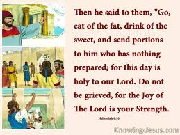 Nehemia – hij was de landvoogd – Ezra, de priester en schrijver, en de Levieten die het volk uitleg gaven, zeiden tegen iedereen: “Deze dag is gewijd aan de HEER, uw God; rouw dus niet, en huil niet!” Het hele volk was namelijk in tranen uitgebarsten toen het de woorden van de wet hoorde. Ezra zei tegen hen: “Maak een feestmaal klaar met lekker eten en drinken en deel ervan uit (2) aan wie niets heeft, want deze dag is gewijd aan onze Heer. Wees niet bedroefd, want in de vreugde die de HEER ons geeft, ligt onze kracht. De Levieten maanden het volk tot stilte. Ze zeiden: ‘Wees stil, dit is een heilige dag, wees dus niet bedroefd.’