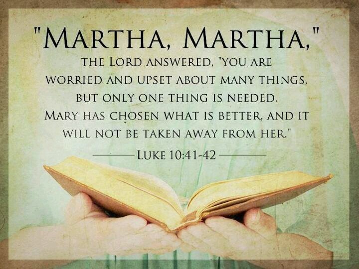‘De Heer zei tegen Martha (die druk was met de zorg voor de gasten): “Martha, Martha, jij maakt je bezorgd en druk over veel dingen, maar weinig zijn nodig of slechts één; want Maria heeft het goede deel uitgekozen, dat van haar niet zal worden weggenomen”.’ (Uit Lukas 10 de verzen 41-42).