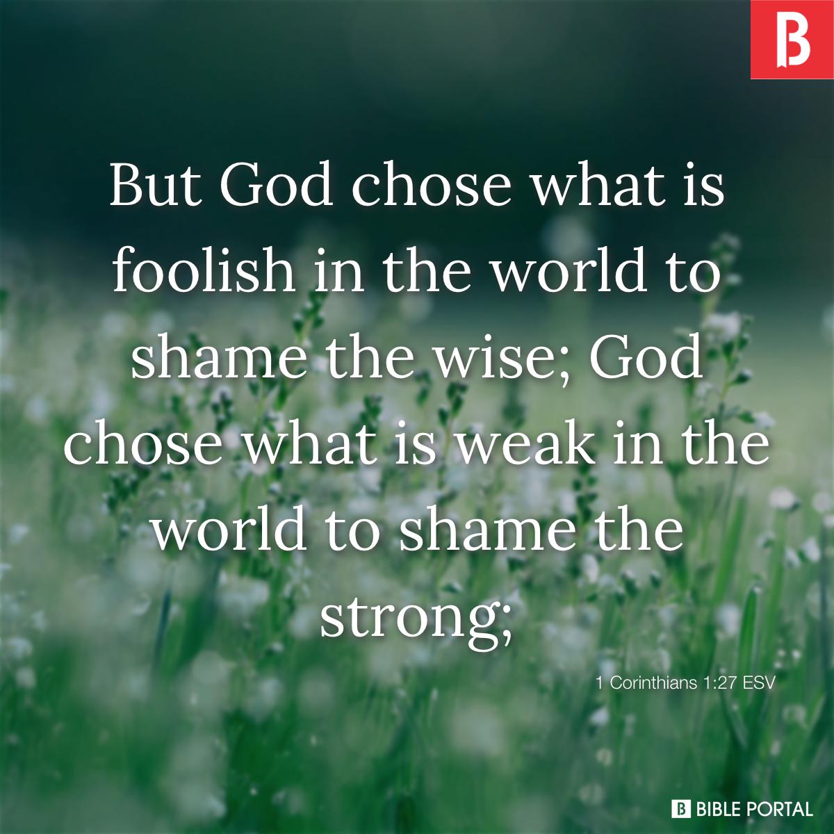 ‘Denk terug aan jullie roeping broeders en zusters. Onder jullie waren er niet veel naar menselijke maatstaf wijs waren, niet veel machtigen, niet veel die van voorname afkomst waren (ze waren er dus wel). Maar wat in de ogen van de wereld dwaas is, heeft God uitgekozen om de wijzen te beschamen; wat in de ogen van de wereld zwak is heeft God uitgekozen om de sterken te beschamen, wat in de ogen van de wereld onbeduidend is en wordt veracht, wat (nog) niets is (en daar behoren ook de kleine kinderen toe), heeft God uitgekozen om wat wél iets is (of meent te zijn) teniet te doen. (3) Zo kan geen mens zich tegenover God beroemen. (4) Door Hem zijn jullie één met Christus, Die dankzij God onze wijsheid is geworden. Door Christus worden wij rechtvaardig en heilig en door Hem worden wij verlost, opdat het zal zijn zoals het geschreven staat: “Wil iemand zich op iets beroemen, laat hij of zij zich op de Heer beroemen.“‘ (Uit 1 Korintiërs 1 de veren 26-31)