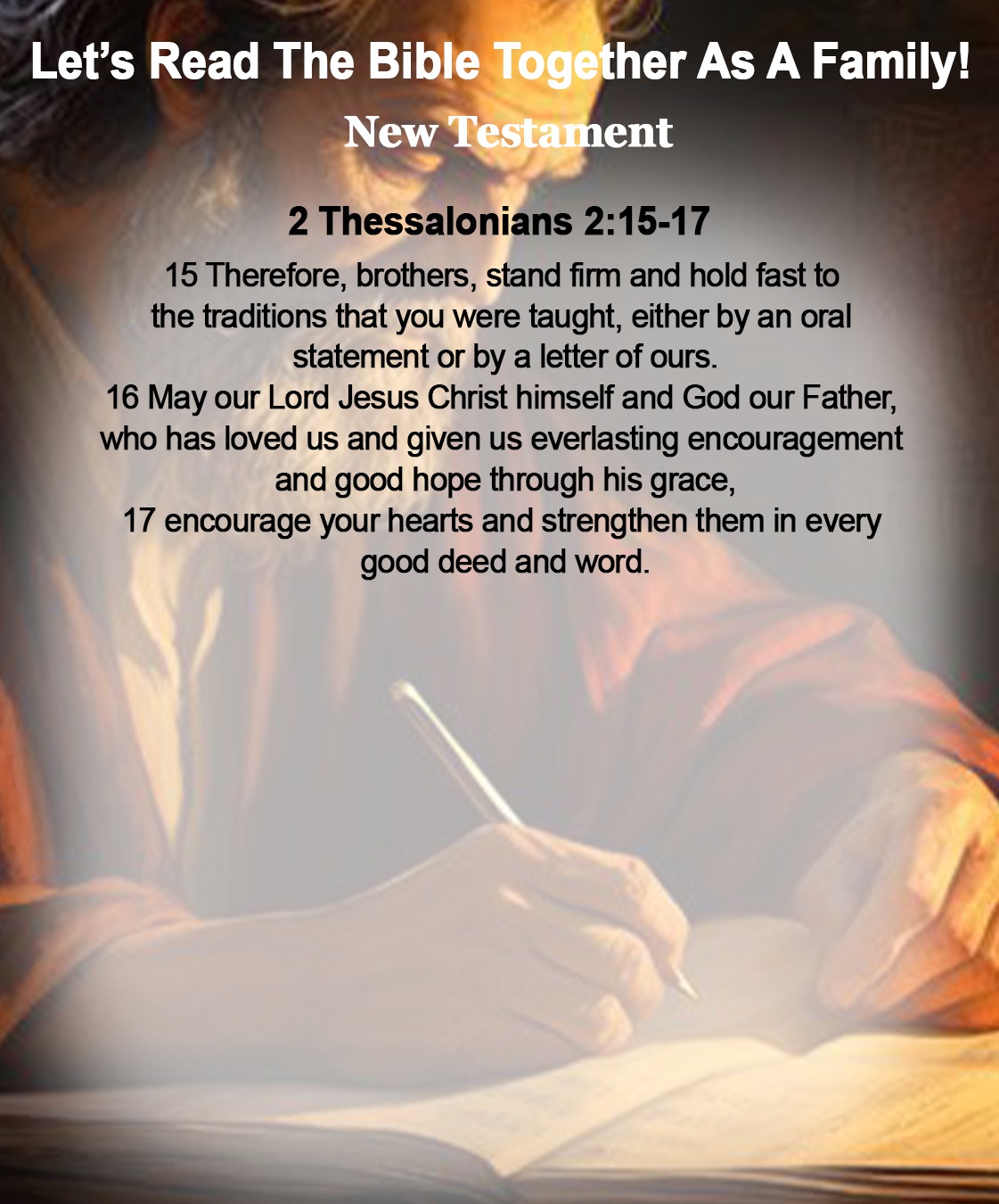 ‘Wees standvastig, broeders en zusters, en blijf bij de traditie waarin jullie onderwezen zijn, in woord en geschrift (lees: door de verkondiging van Gods Woord en in de brieven die wij apostelen – en later ook onze Heer nog! – jullie geschreven hebben). Moge onze Heer Jezus Christus en God, onze Vader, Die ons Zijn liefde heeft getoond en ons door Zijn genade blijvende steun en goede hoop gegeven heeft, jullie aanmoedigen en sterken in al het goede dat jullie doen en zeggen.’ (Uit 2 Tessalonicenzen 2 uit de verzen 13-17 : 15-17 – lees alle genoemde verzen)