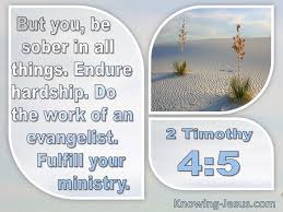 ‘Ze zullen niet meer naar de waarheid (van het verkondigde Evangelie) luisteren, maar naar (eigen) verzinsels. Jij echter moet in alles nuchter zijn, je lijden (in vertrouwen op God) aanvaarden, je werk als verkondiger van het Evangelie blijven doen, je dienende (niet heersende) taak vervullen.’ (Uit 2 Timoteüs 4 uit de verzen 1-8 : 4-5)