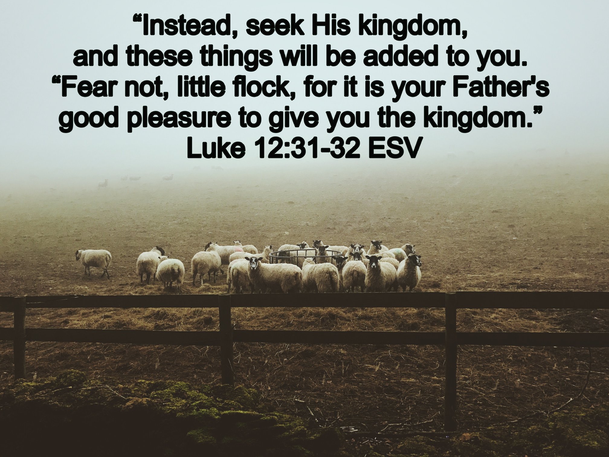 ‘Zoek liever Zijn Koninkrijk, en die andere dingen zullen je erbij gegeven worden. Vrees niet, kleine kudde, want jullie Vader heeft jullie het Koninkrijk willen schenken.‘ (Uit Lukas 12 uit de verzen 22-34 : 31-32)
