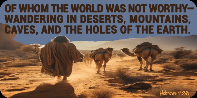 ‘Ze zwierven rond in schapenvachten of geitenvellen, berooid, vernederd en mishandeld. Ze doolden door verlaten oorden en berggebieden en verscholen zich in holen en grotten onder de grond. Ze waren voor de wereld te goed. Al deze mensen, die van oudsher om hun geloof geprezen werden, hebben de belofte hier in deze wereld niet in vervulling zien gaan omdat God voor ons iets beters had voorzien en Hij hen niet zonder ons de volmaaktheid wilde laten bereiken.’ (Uit Hebreeën 11 de verzen 13-16)
