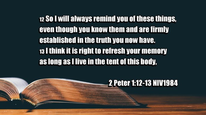 ‘Daarom zal ik jullie hieraan blijven herinneren, hoewel jullie dit alles weten en gegrondvest bent in de waarheid die jullie hebben leren kennen. (2) Maar het lijkt me goed jullie wakker te houden door het telkens opnieuw onder jullie aandacht te brengen zolang ik in deze tent verblijf [=lichamelijk op deze wereld onder jullie ben en met jullie meeleven kan].’ (…) ‘Ons vertrouwen in de (OT-) profeten is alleen maar toegenomen. Ook jullie doen er goed aan jullie aandacht daarop gericht te houden, als op een lamp die in een donkere ruimte schijnt, totdat de Morgenster opgaat in jullie hart. Besef daarbij dat geen enkele profetie uit de Schrift een eigenmachtige uitlegging toelaat, want nooit is profetie voortgekomen uit menselijk initiatief: mensen die namens God spraken werden daartoe altijd gedreven door de Heilige Geest.’