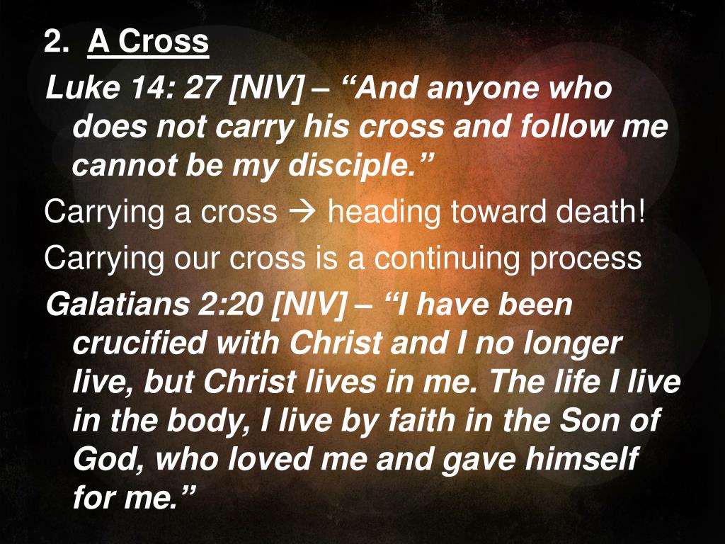 ‘Wie niet zijn of haar kruis draagt en Mij op Mijn weg volgt, kan niet Mijn leerling zijn.‘ (Uit Lukas 14 uit de verzen 25-35 : 27)