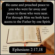 ‘Want Hij is onze vrede, Hij die met Zijn dood de twee werelden één heeft gemaakt, de muur van vijandschap ertussen heeft afgebroken en de Wet met zijn geboden en voorschriften buiten werking heeft gesteld om uit die twee Zichzelf één nieuwe Mens te scheppen. Zo bracht Hij vrede en verzoende Hij door het kruis beide in één lichaam met God, door in Zijn lichaam (binnen Zijn gemeente) de vijandschap te doden. Vrede kwam Hij verkondigen aan jullie die ver weg waren en vrede aan hen die dichtbij waren: dankzij Hém hebben wij allen door één Geest toegang tot de Vader.’ (Uit Efeziërs 2 uit de verzen 1-22 : 14-18)