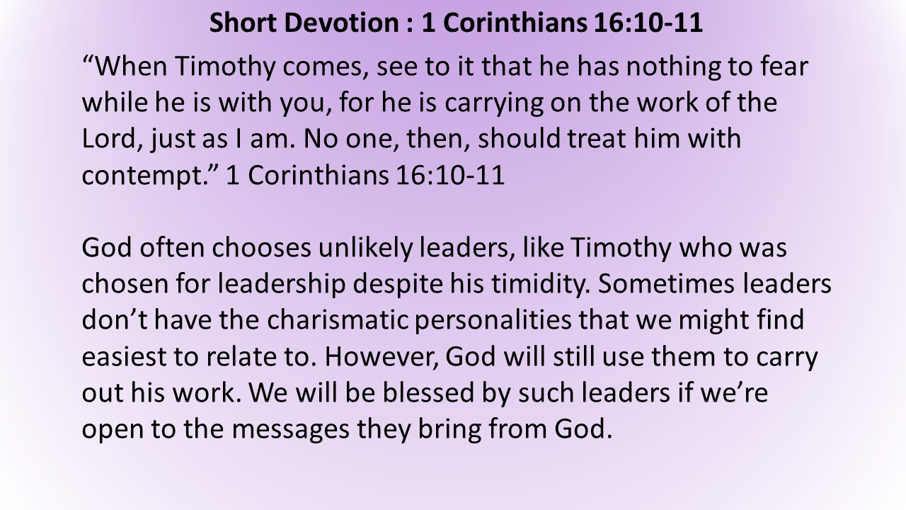 “Zorg ervoor dat jullie Timoteüs niet afschrikken wanneer hij bij jullie komt, want hij werkt net als ik ten dienste van de Heer. Dus niemand mag op hem neerzien.’ (Uit 1 Korintiërs 16 de verzen 10-11 – zie hierbij ook 1 Korintiërs 4 : 6-7 en 1 Timoteüs 4 : 1-13)