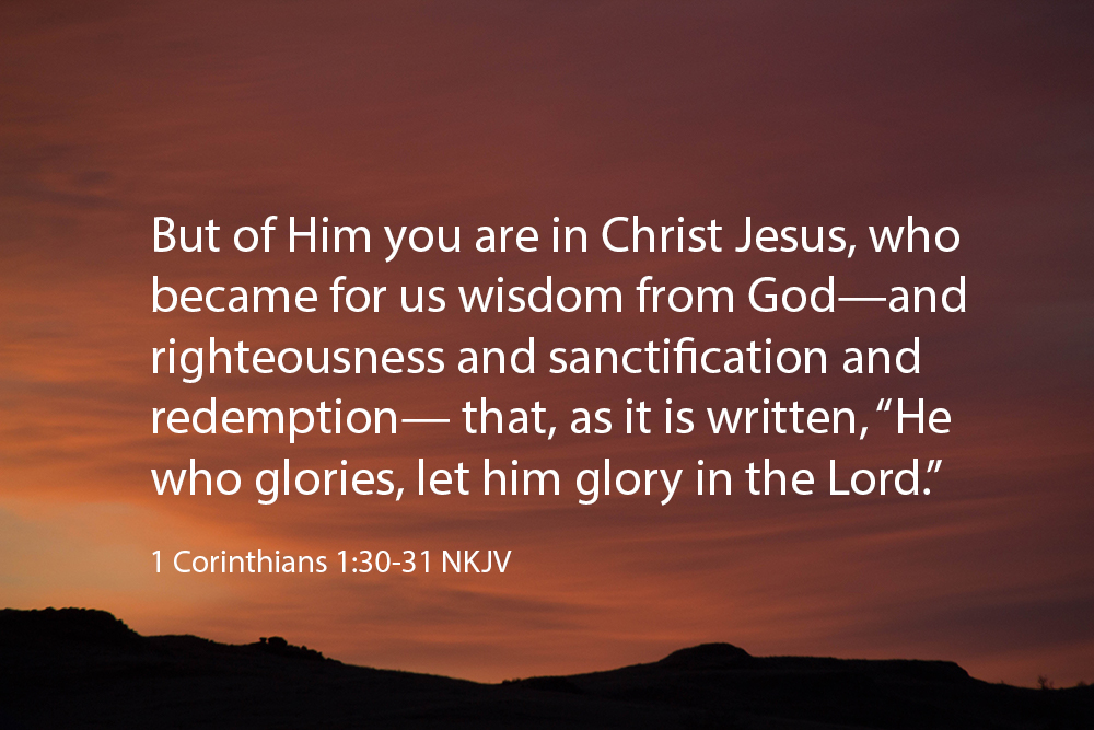 ‘Door Christus worden wij rechtvaardig en heilig en door Hém worden wij verlost, opdat het zal zijn zoals geschreven staat: “Wil iemand zich beroemen, laat hij/zij zich op de Heer beroemen.”‘ (Uit 1 Korintiërs 1 de verzen 26-31 : 30b-31)