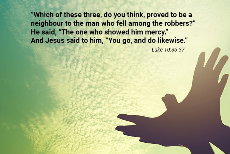 ‘Een Samaritaan echter, die op reis was, kreeg medelijden toen hij hem zag liggen. Hij ging naar de gewonde man toe, goot olie en wijn over zijn wonden en verbond ze. Hij zette hem op zijn eigen rijdier en bracht hem naar een logement, waar hij voor hem zorgde.‘ (Uit Lukas 10 : 25-37 : 33-34)
