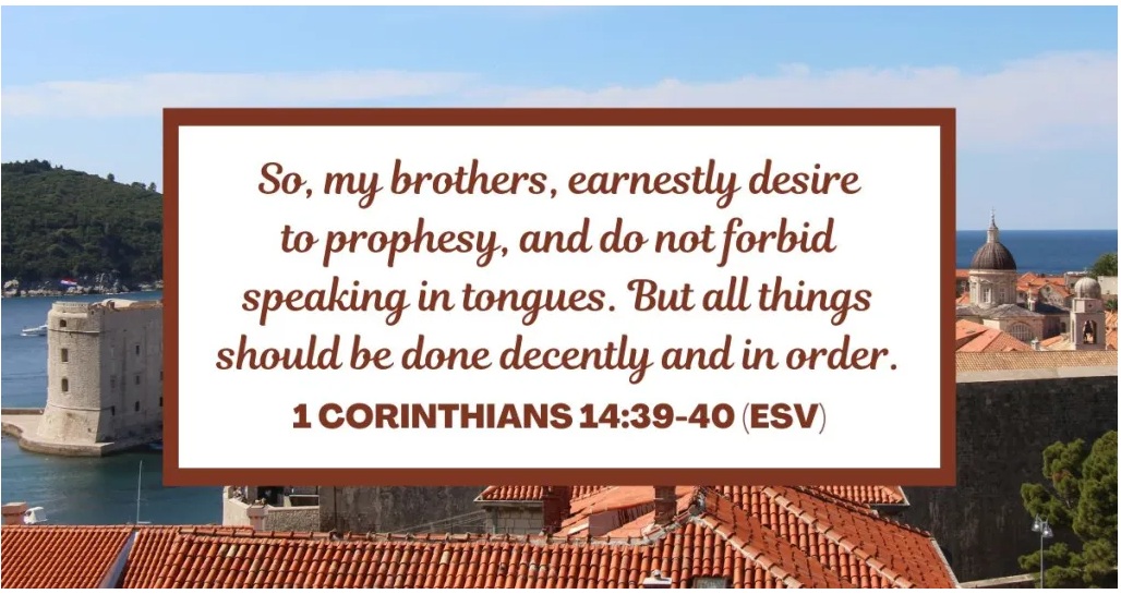 ‘Kortom broeders en zusters, streef ernaar te profeteren en verhinder niet dat er in klanktaal gesproken wordt – maar handel bij dat laatste naar wat ik erover schreef betreffende het gebruik in jullie samenkomsten. Alles moet op gepaste wijze en in goede orde gebeuren‘ – dus ten bate van de opbouw van de gemeente – lees hierbij 1 Korintiërs 3 : 10-23! (Uit 1 Korintiërs 14 : 39-40)