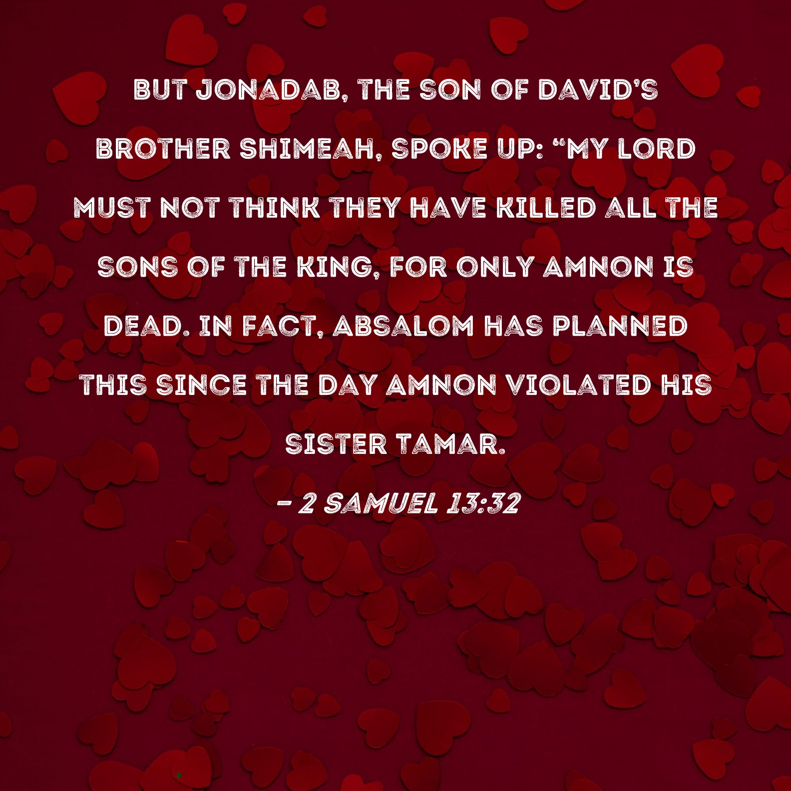‘Absalom vroeg aan Tamar: “Is Amnon je te na gekomen? Zwijg dan zusje, hij is je broer; je doet er beter aan het te laten rusten.” Tamar bleef voortaan bij haar broer van het leven afgesneden. Toen koning David hoorde wat er gebeurd was werd hij woedend. Absalom sprak er niet met Amnon over, er viel tussen hen geen onvertogen woord, maar hij haatte hem omdat hij zijn zuster Tamar had onteerd.‘ (Uit 2 Samuël 13 de verzen 20-22)