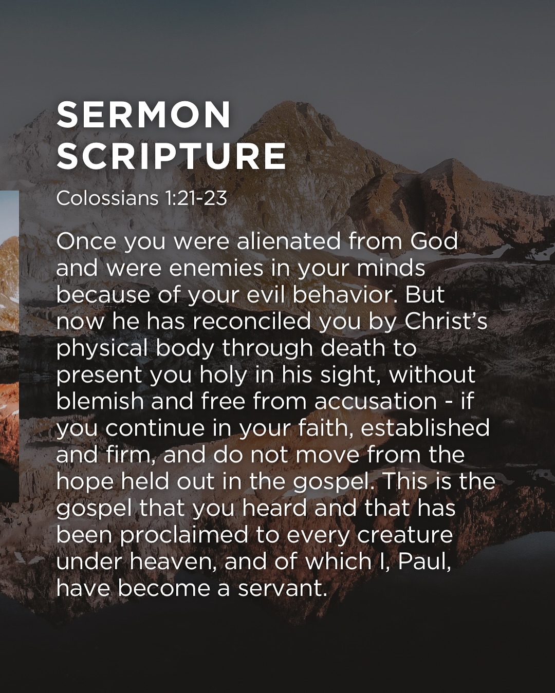 ‘Eerst waren jullie vervreemd van Hem en waren jullie Hem in al het kwaad dat jullie deden vijandig gezind, maar nu heeft Hij jullie door de dood van Zijn aardse lichaam met zich verzoend – de vijandschap weggenomen – om jullie heilig, zuiver en onberispelijk bij Zich te brengen – toen jullie je lieten dopen -. Maar dan moeten jullie wel blijven geloven, onwrikbaar gegrondvest in de hoop die het Evangelie ons brengt, het Evangelie dat jullie van ons gehoord hebben en dat aan alle schepselen onder de hemel verkondigd is, en waarvan (ook) ik Paulus (naast de andere apostelen), een dienaar geworden ben.’ (Uit Kolossenzen 1 : 21-23)