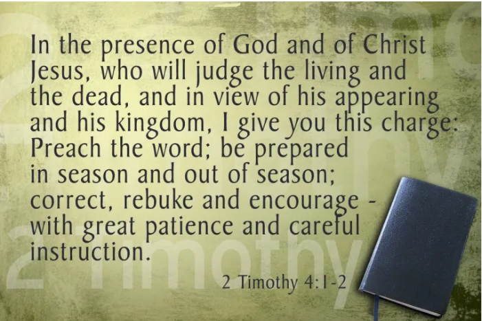 ‘Ik roep je dringend op, ten overstaan van God en Christus Jezus, Die zal oordelen over levenden en doden, ik bezweer je bij Zijn komst en heerschappij: Verkondig de Boodschap*, blijf aandringen, of het nu uitkomt of niet, wijs terecht, bestraf en vermaan met alle geduld dat het onderricht vereist. Want er komt een tijd dat de mensen de heilzame leer niet meer verdragen, maar leraren om zich heen verzamelen die aan hun verlangens tegemoet komen en hen naar de mond praten. Ze zullen niet meer naar de waarheid luisteren, maar naar verzinsels. Jij echter moet in alles nuchter zijn, je lijden aanvaarden, je werk als verkondiger (!) van het Evangelie doen, je dienende (!) taak vervullen. (Uit 2 Timoteüs 3 en 4 de verzen 1-5, van 4)
